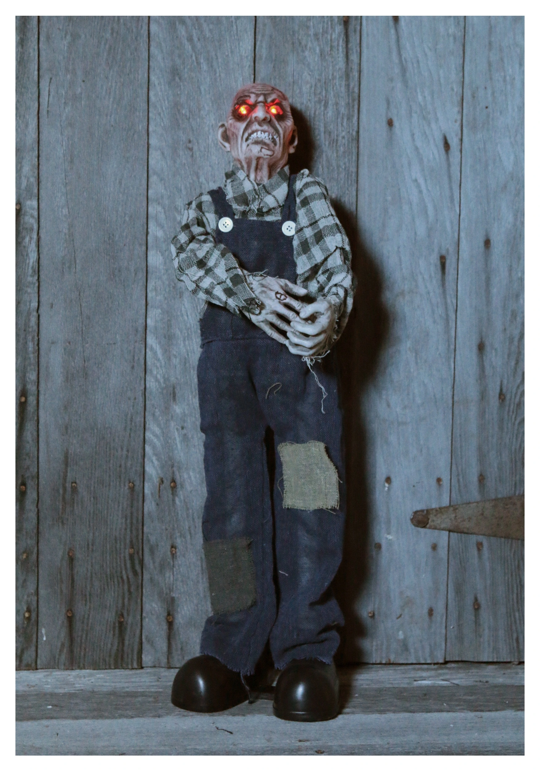 This guy will scare almost anyone. He makes and evil-sounding laugh as his eyes flash and his arms & head move. This 30 Inch Plaid Moving Zombie Prop would be great in a graveyard scene. Just imagine–he was digging a grave for someone, when someone ELSE came out of it and bit him….