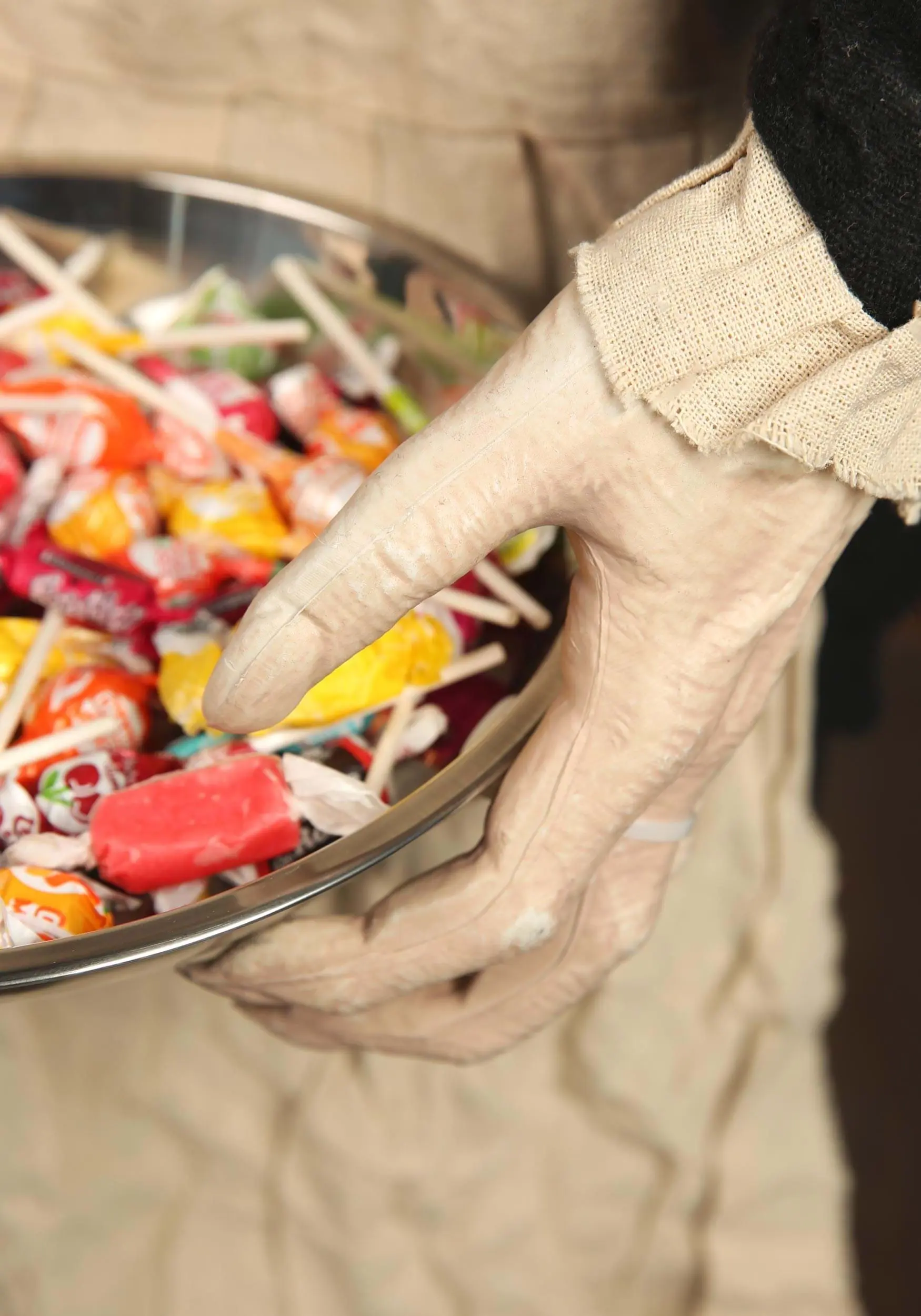 - Molded poly-foam face and hands with realistic details, polyester and broadcloth fabrics.