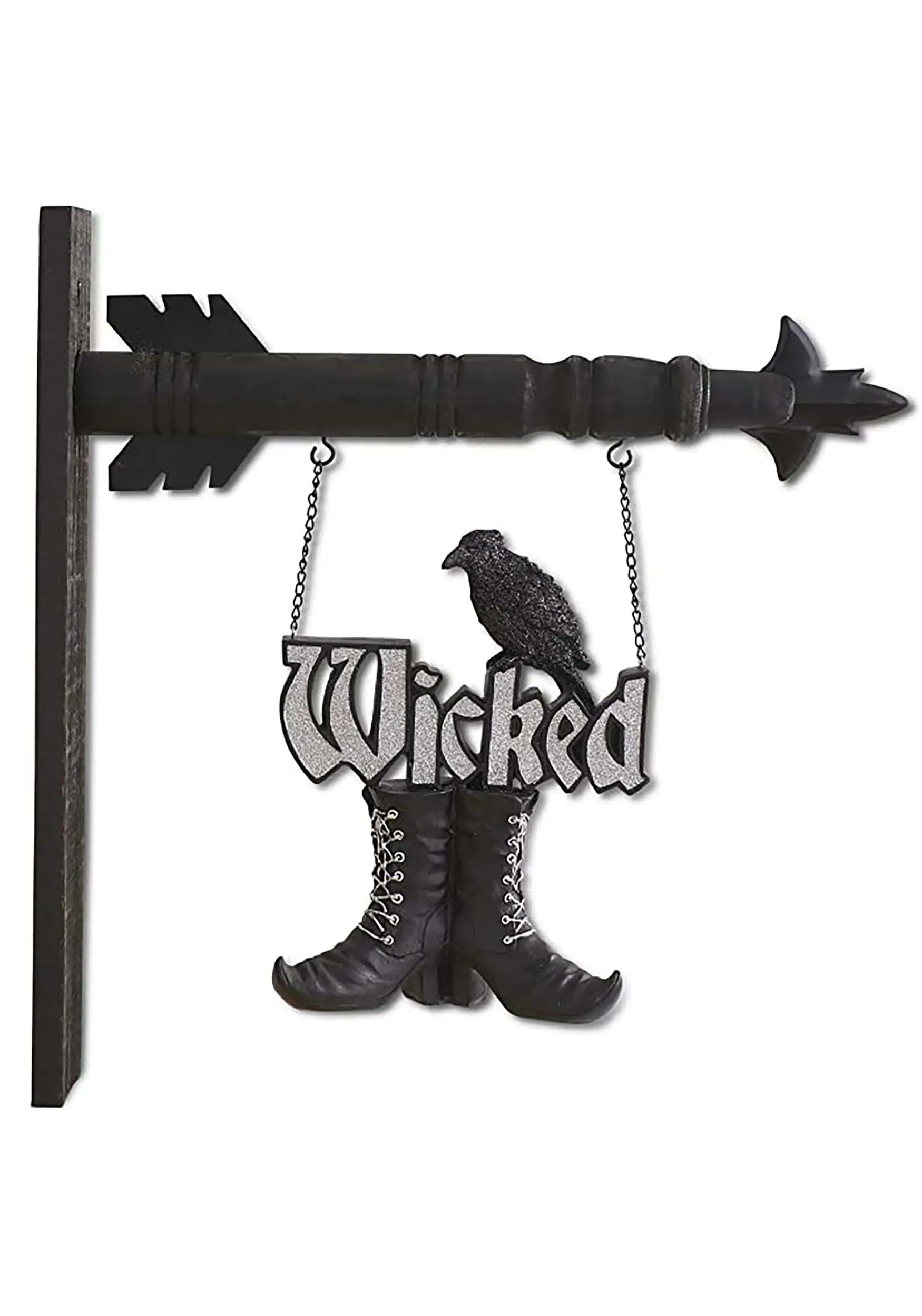 - Figure has a 4″ long metal chain attached at each end of the word “Wicked” to hang from arrow sign