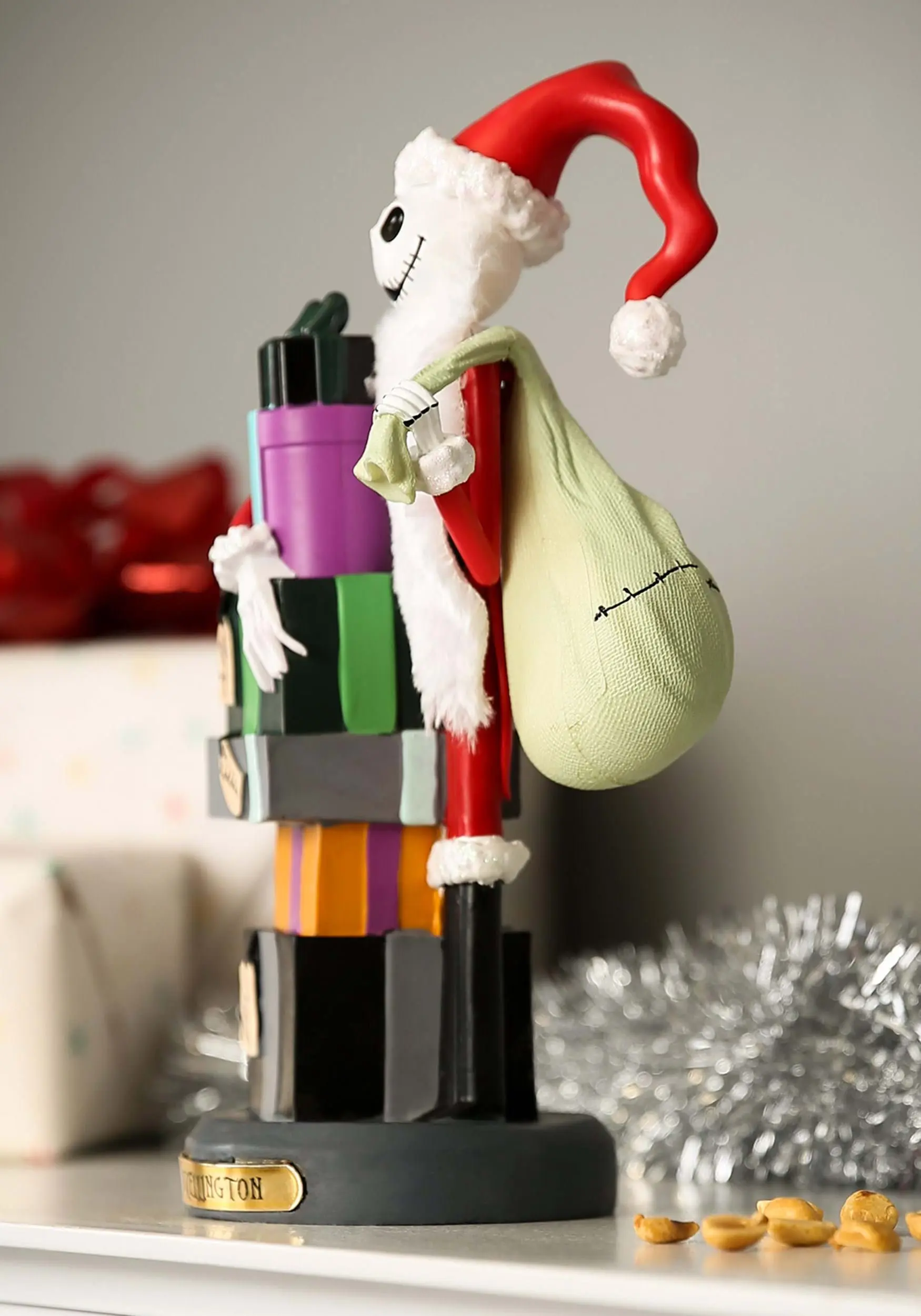 This officially licensed 10″ Nightmare Before Christmas Jack Skellington Nutcracker is more likely to prompt excited rather than scared screams! A bearded Jack wears a Santa suit and leans on a stack of presents.