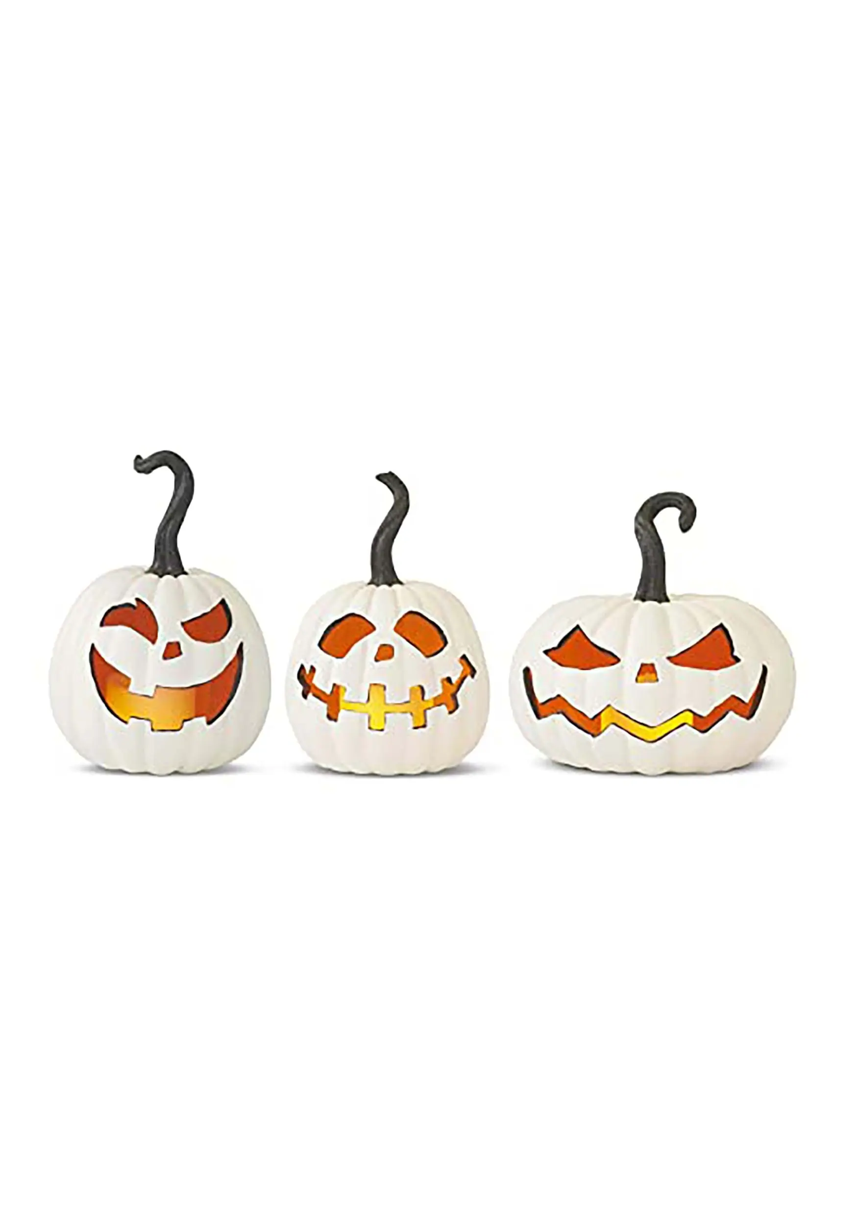This is a Set of Three White Resin LED Flicker Flame Jack O Lanterns.