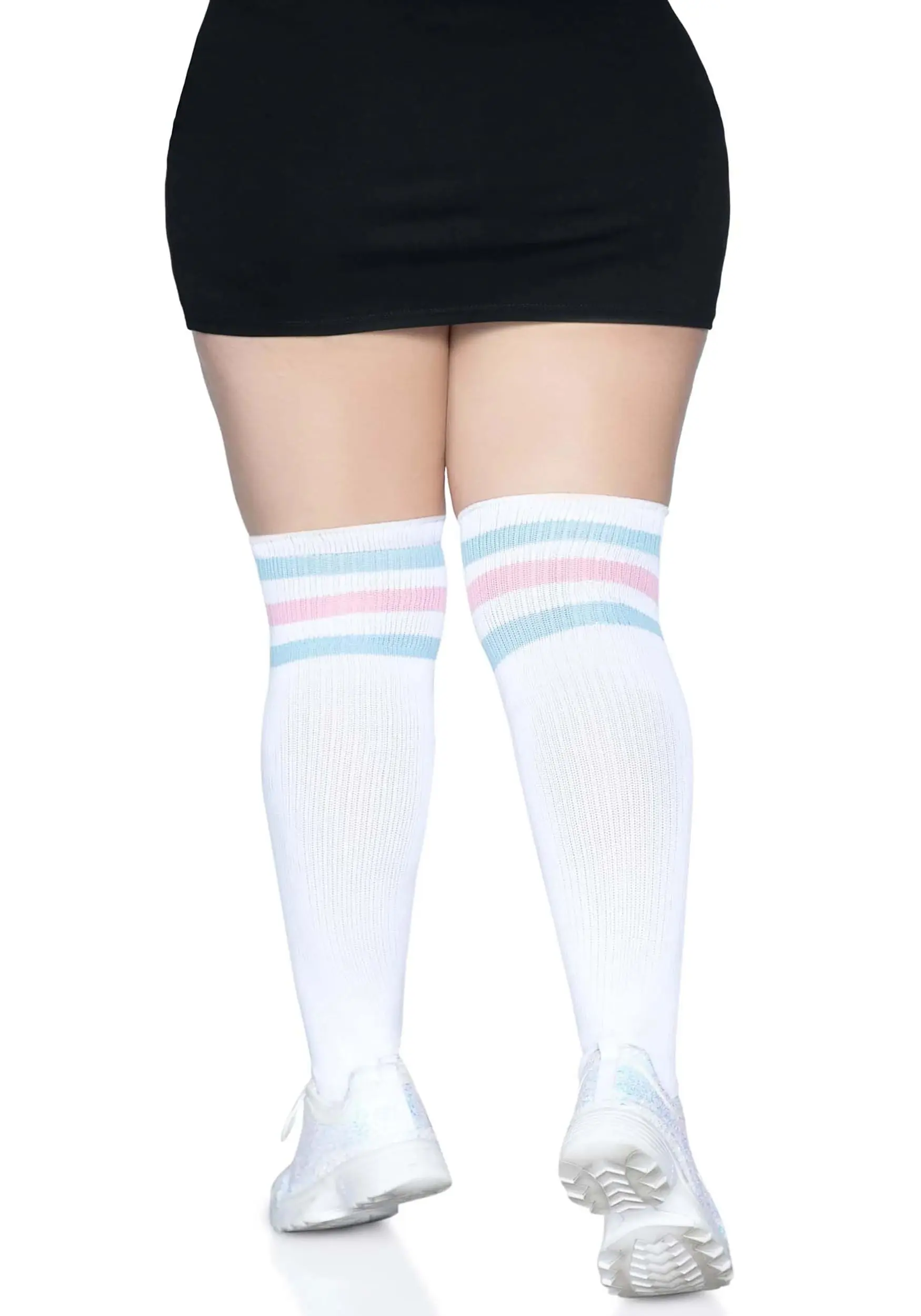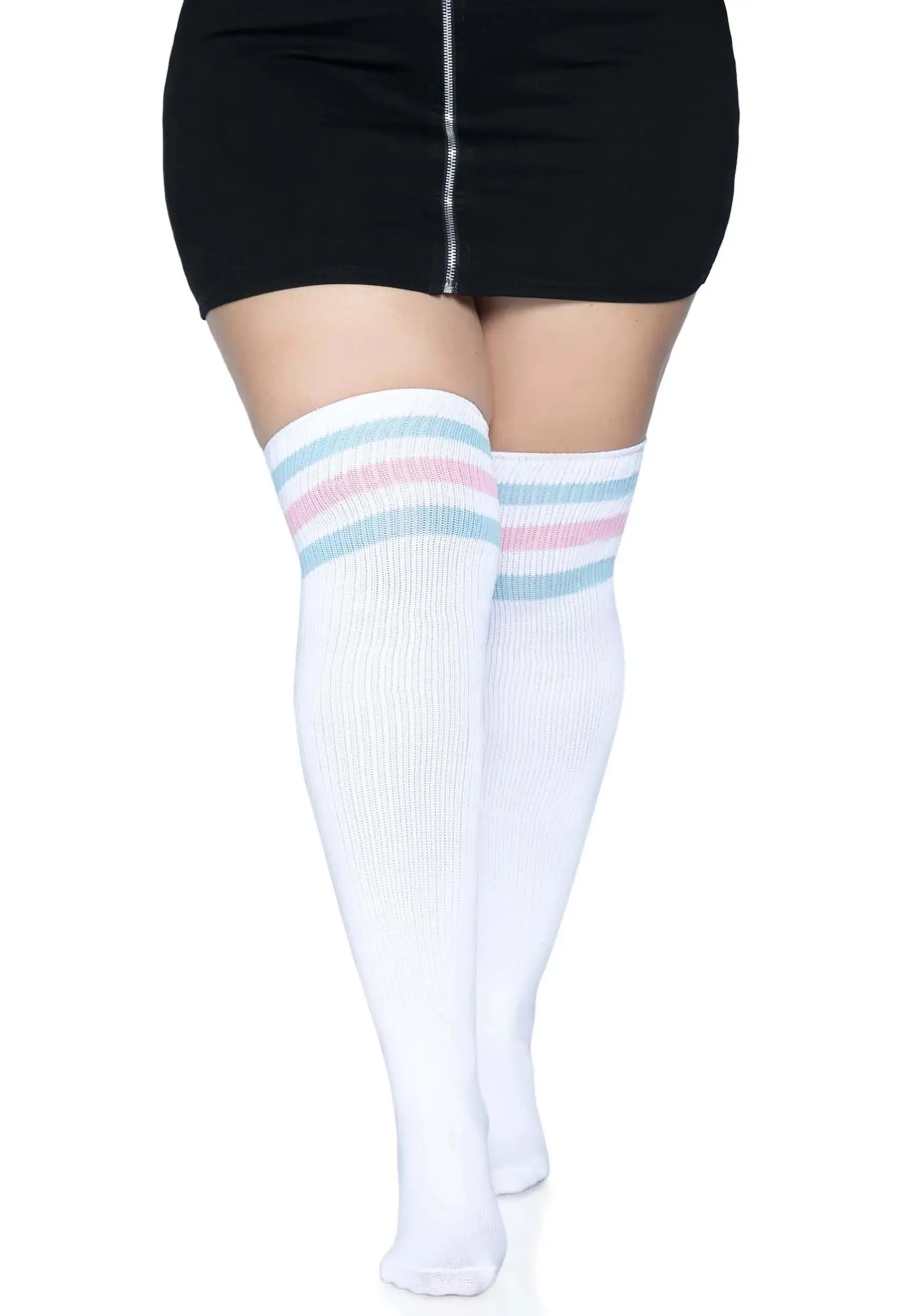 This is a pair of Women’s Plus White Athletic Socks with Pink and Blue Stripes.